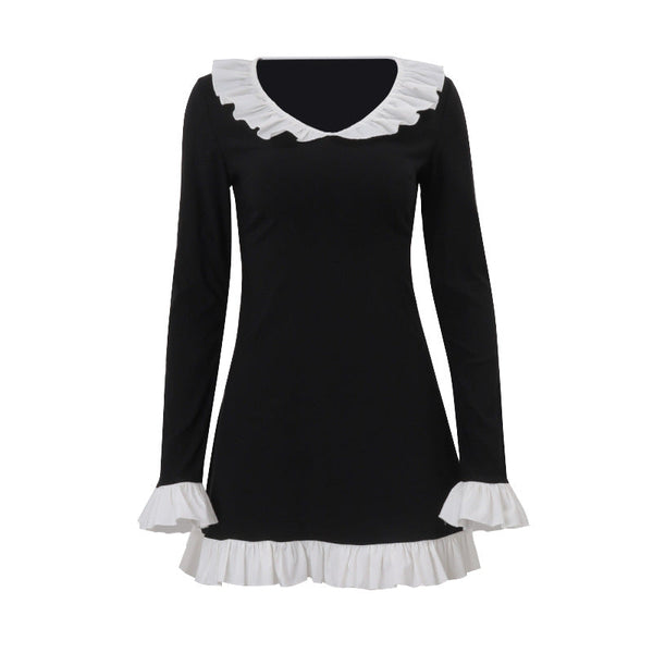 Mini vestido de manga corta con volantes y cuello cuadrado acanalado liso gótico Moda Darkwave alternativa moda gótica victoriana gótica Moda Darkwave emo