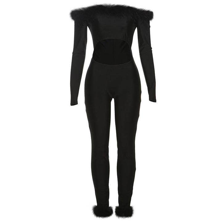 Long sleeve off shoulder feather hollow out jumpsuit