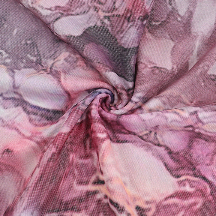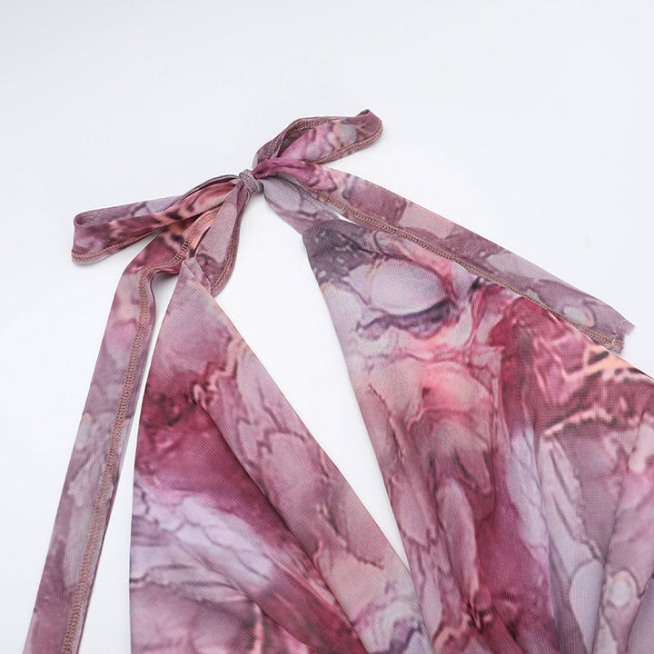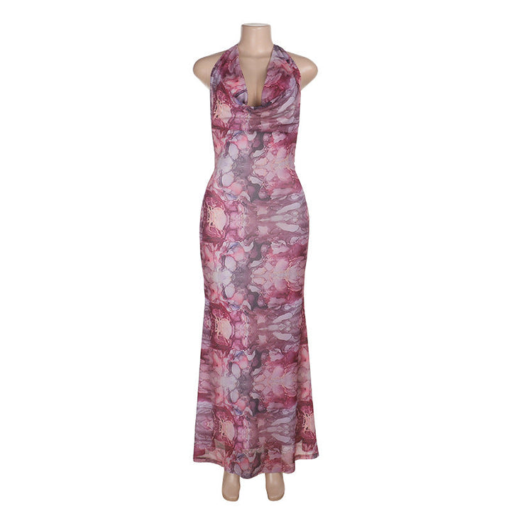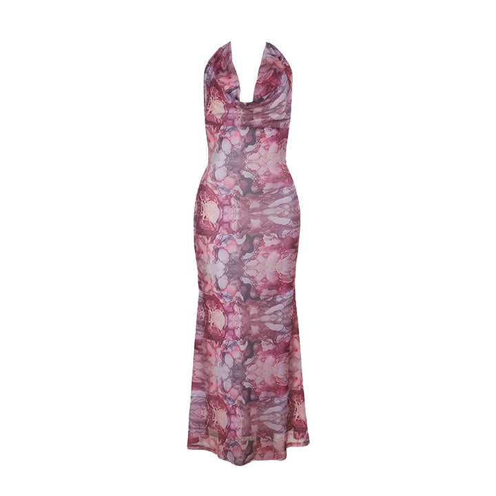 Cowl neck halter self tie print mesh maxi dress