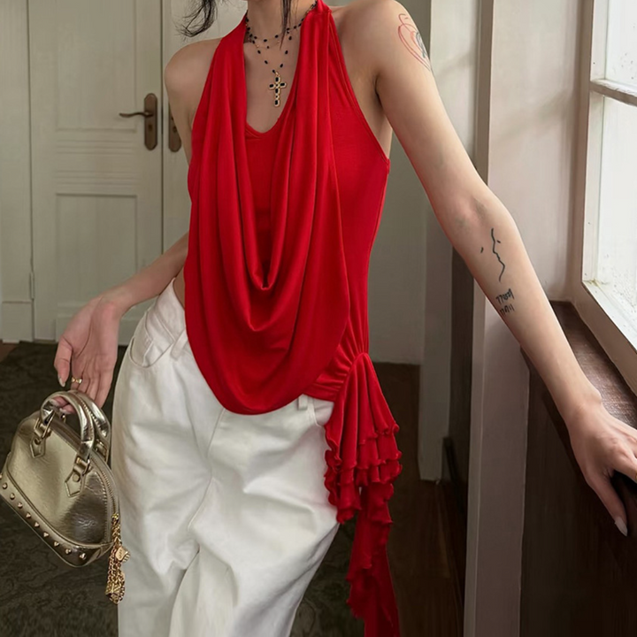 Halter irregular ruched backless solid top