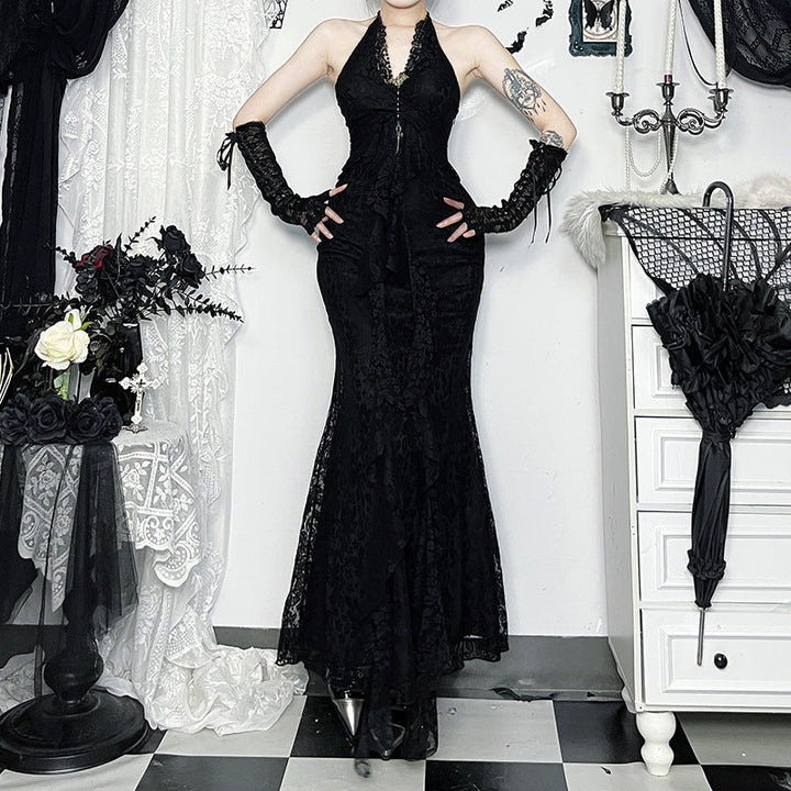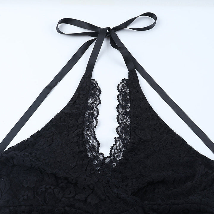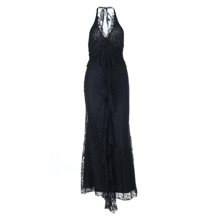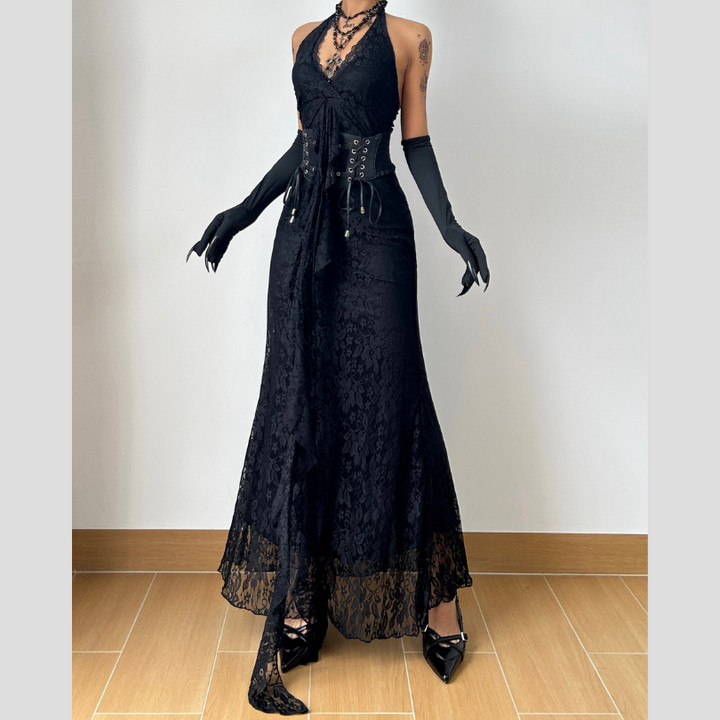 Halter self tie lace hem v neck maxi dress