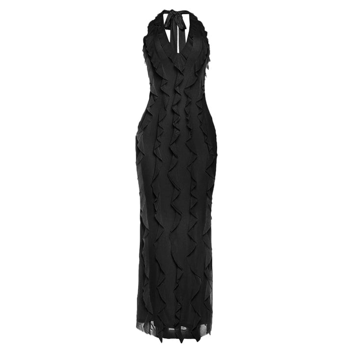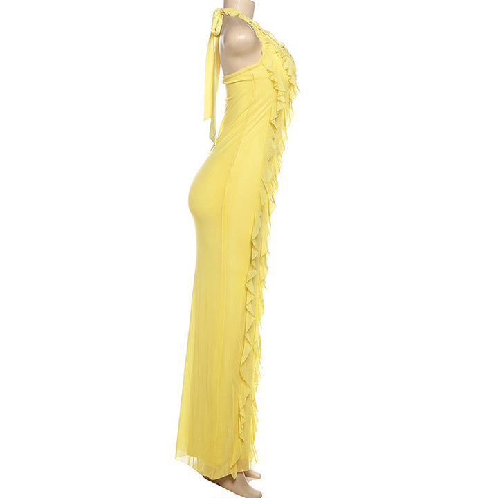 Halter self tie ruffle v neck solid maxi dress