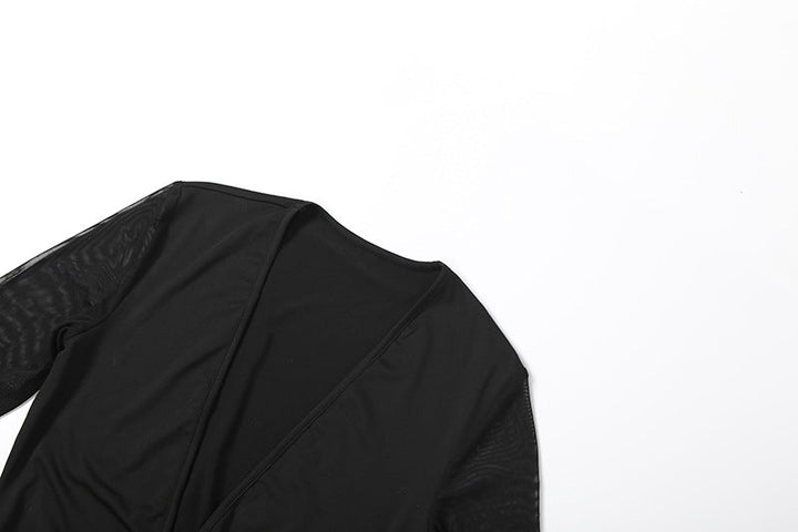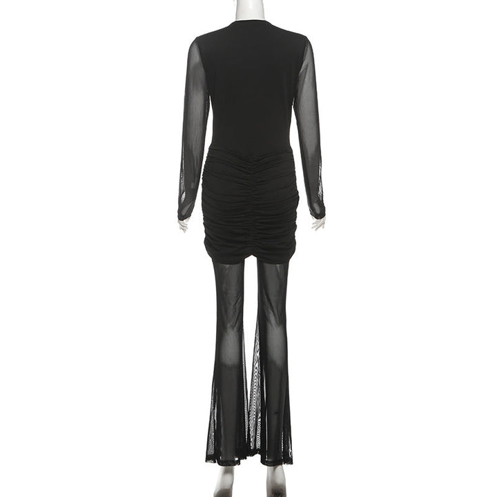 Long sleeve v neck mesh ruched jumpsuit