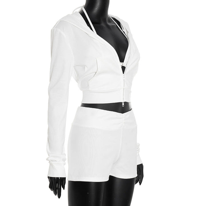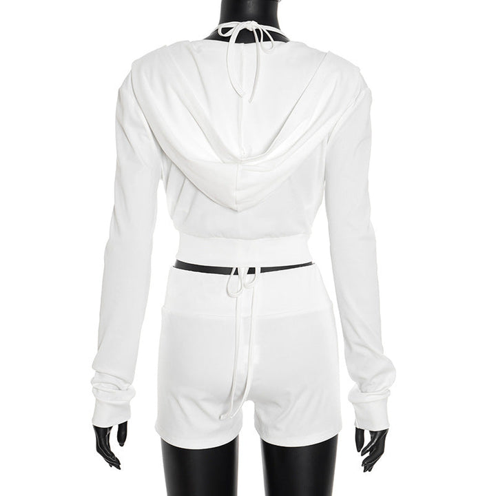 Long sleeve zip-up hoodie self tie halter pant set