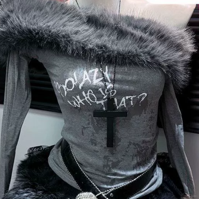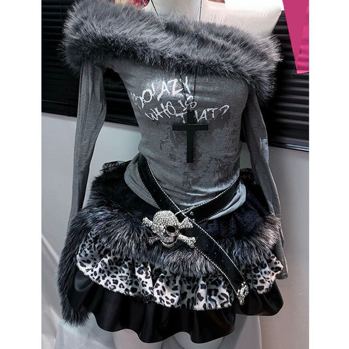 Off shoulder long sleeve fluffy letter print mini skirt set