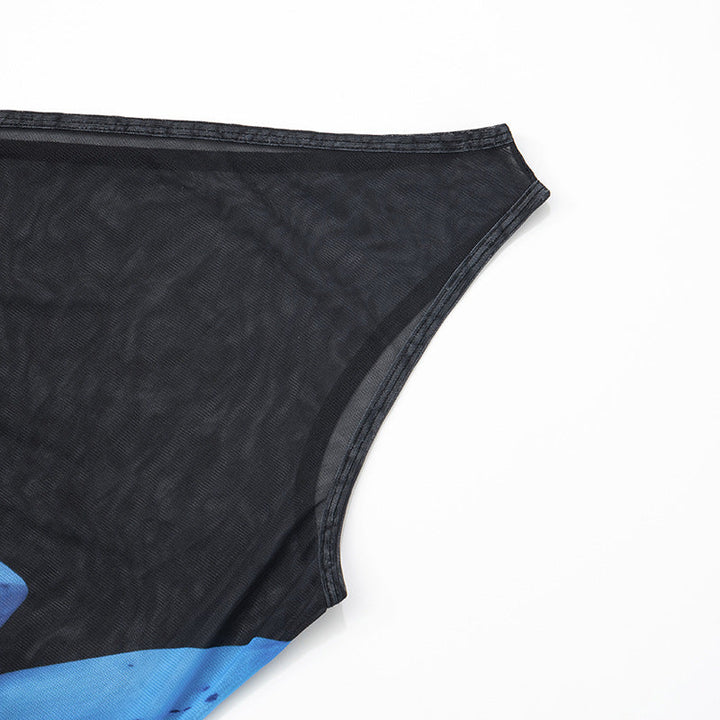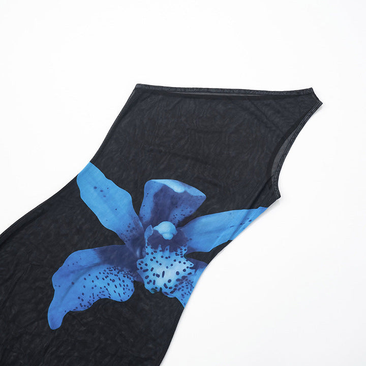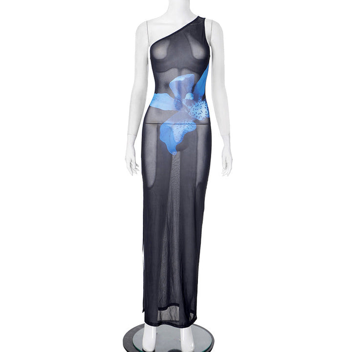 One shoulder flower print mesh maxi dress