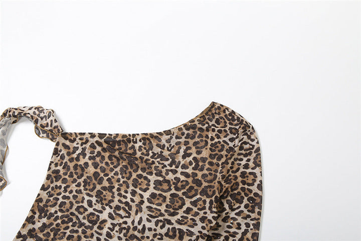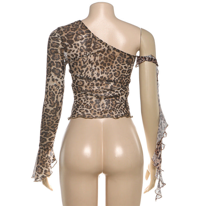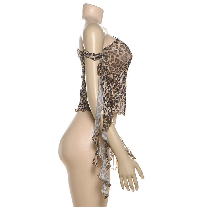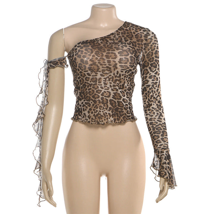 One shoulder leopard print ruffle mesh top