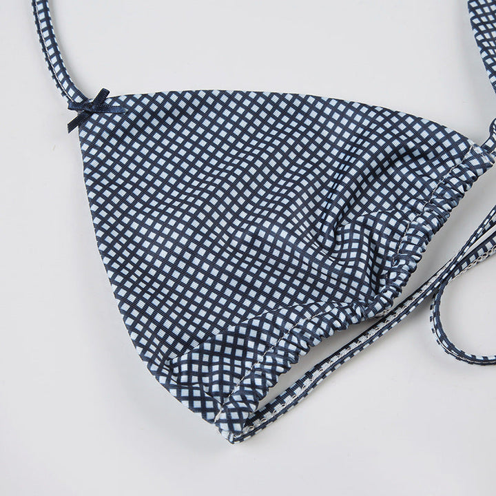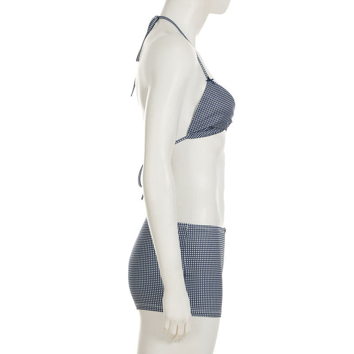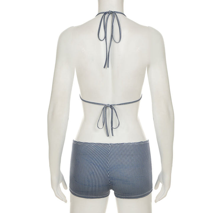 Plaid self tie halter bowknot low rise pant set