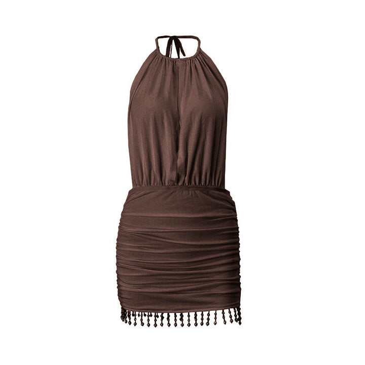 Ruched halter self tie beaded mini dress