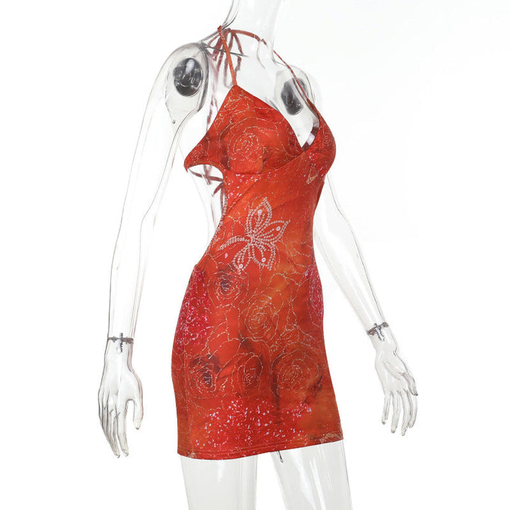 Self tie halter v neck print backless mini dress