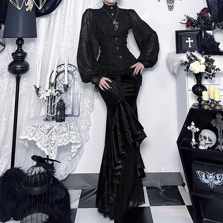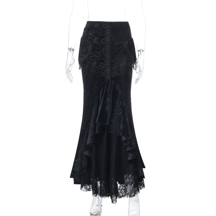 Velvet lace hem tassels maxi skirt