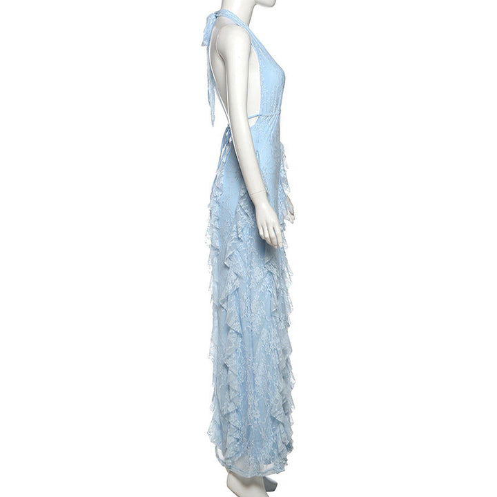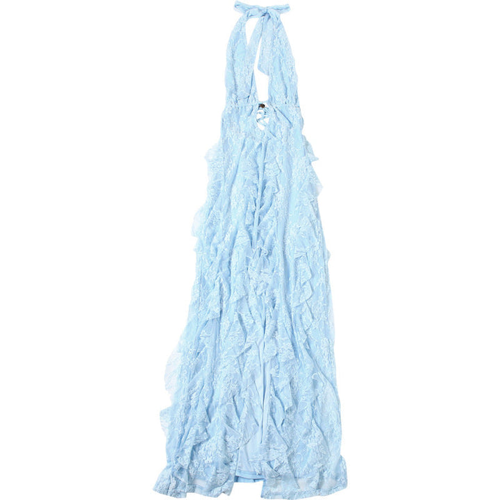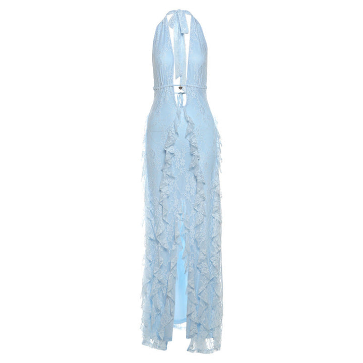 Halter deep v neck ruffle slit maxi dress