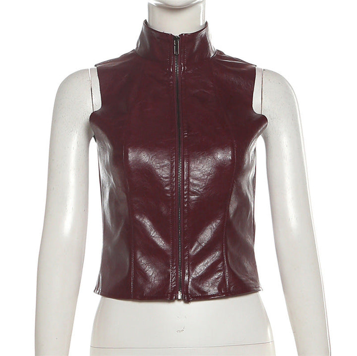 High neck zip-up PU leather sleeveless top