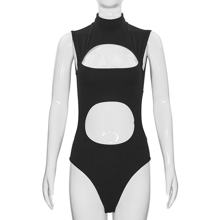 Hollow out high neck sleeveless solid bodysuit