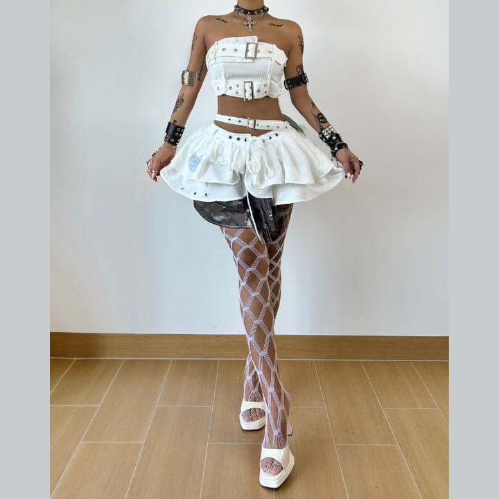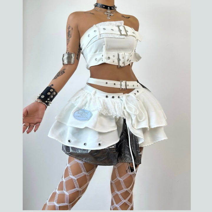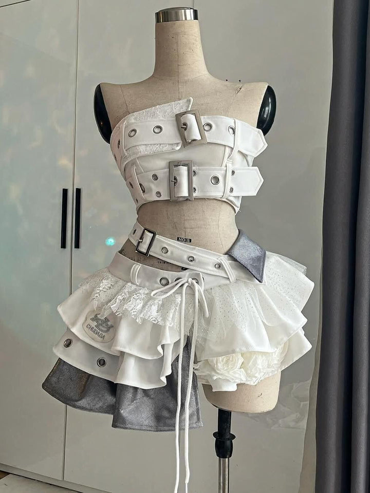 Irregular buckle patchwork lace mini skirt set