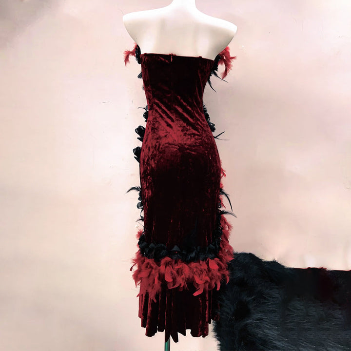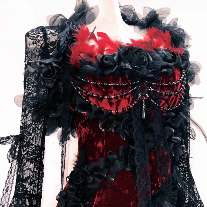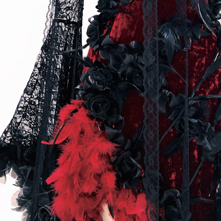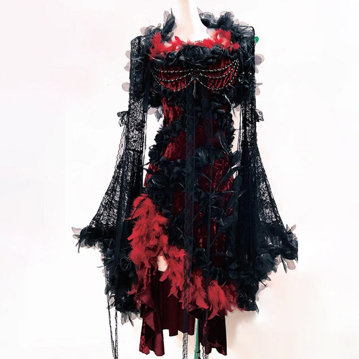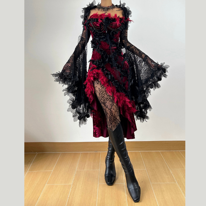 Long flared sleeve lace flower applique irregular mini dress