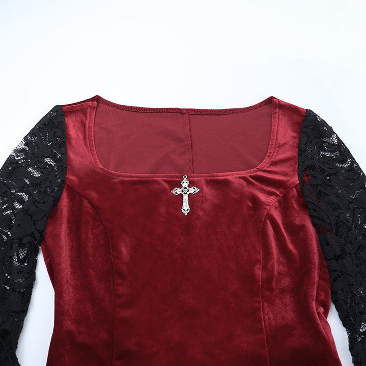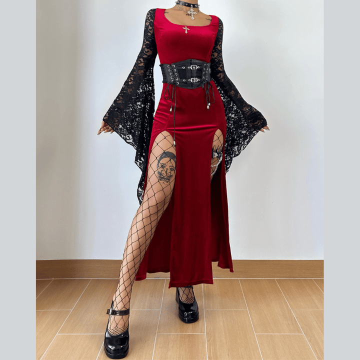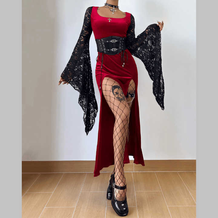 Long flared sleeve lace square neck slit midi dress
