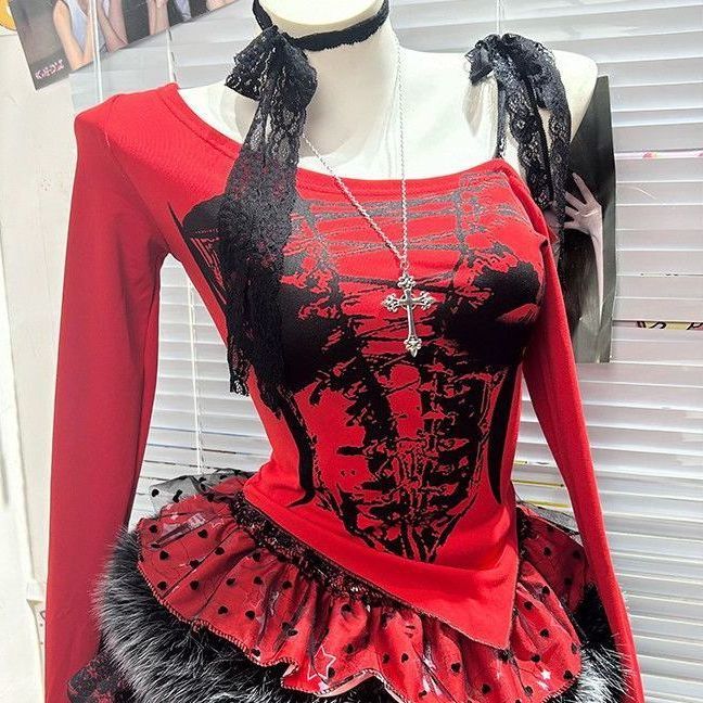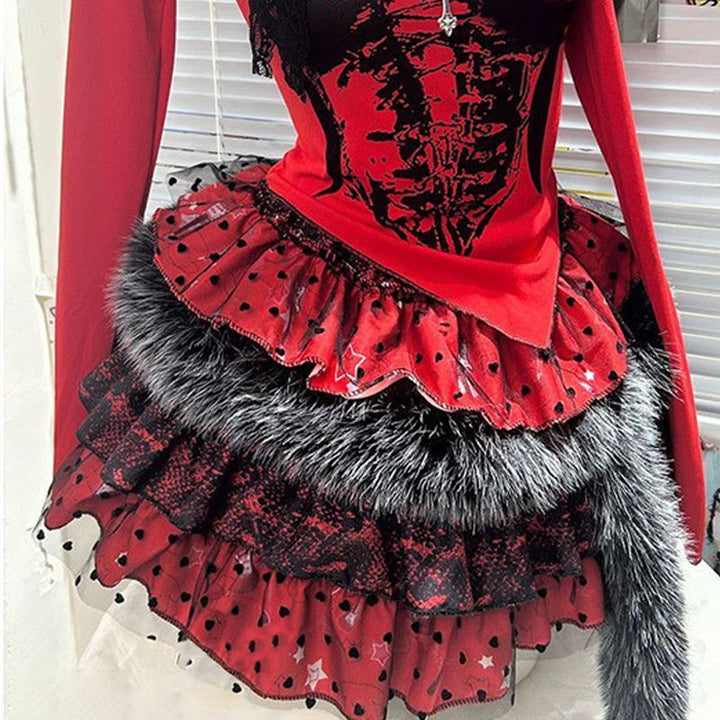 Long sleeve fluffy polka dot lace hem mini skirt set