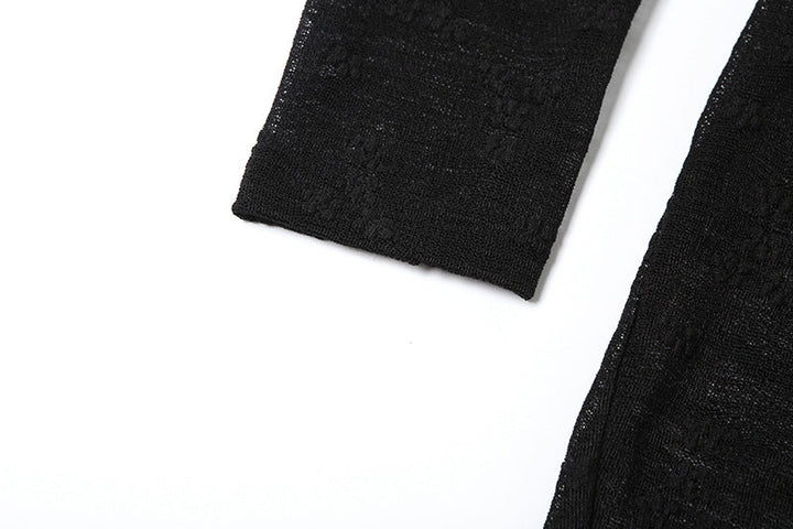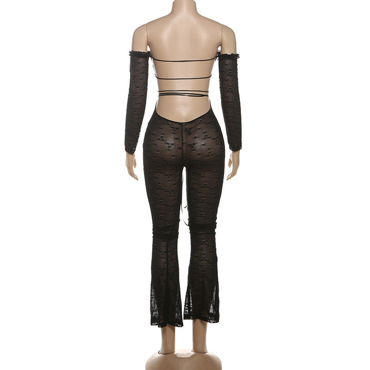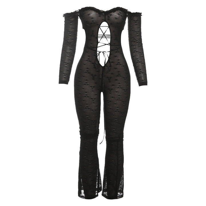 Off shoulder long sleeve hollow out lace hem jumpsuit