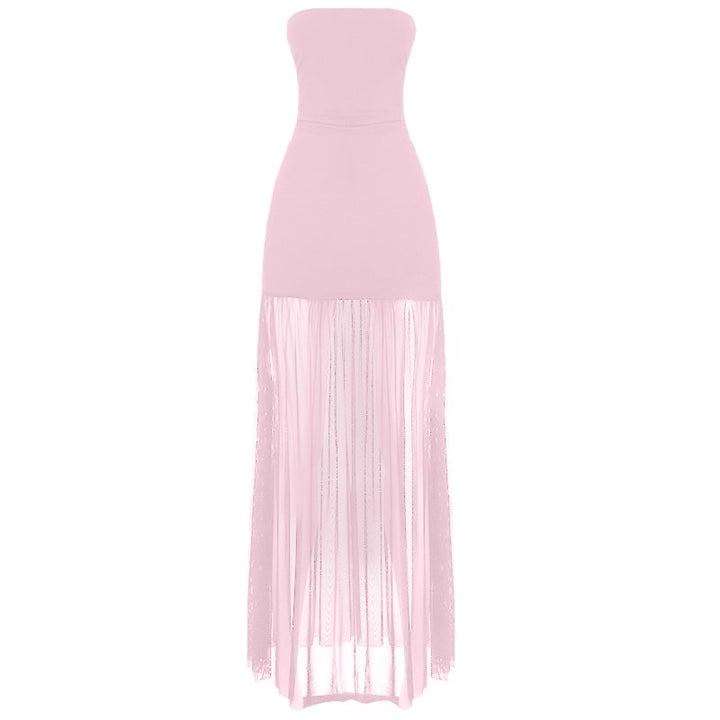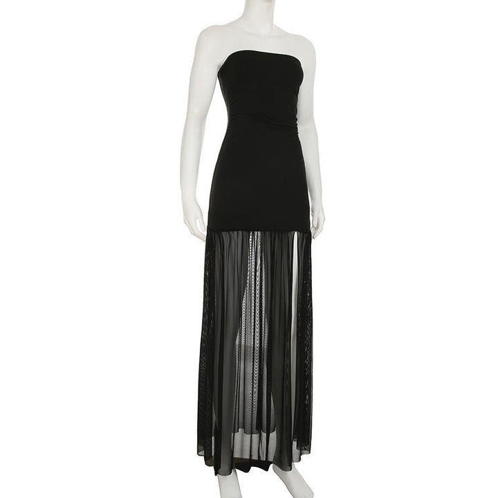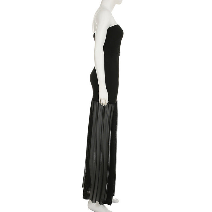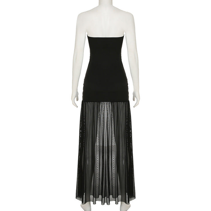 Slit mesh ruched backless tube maxi dress