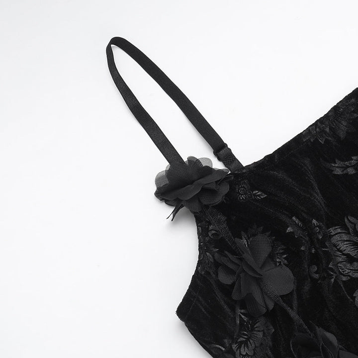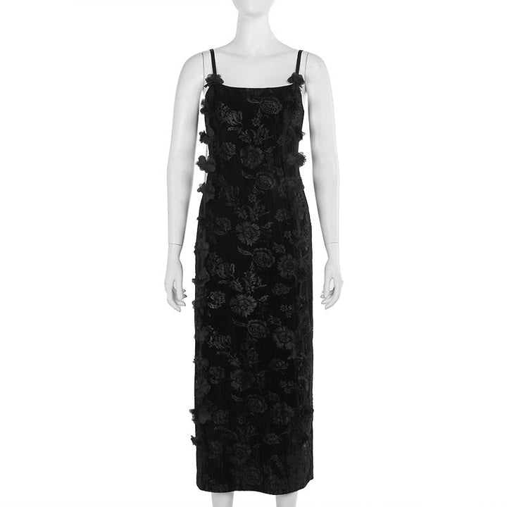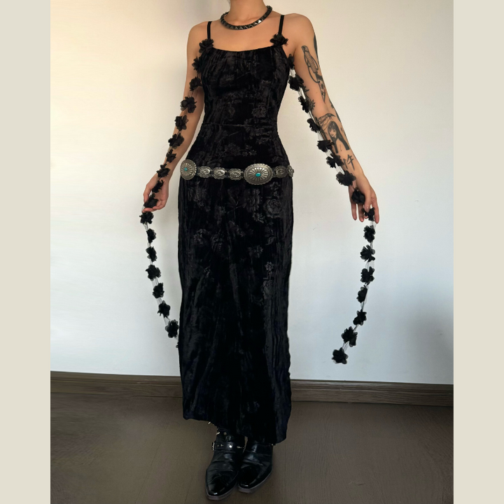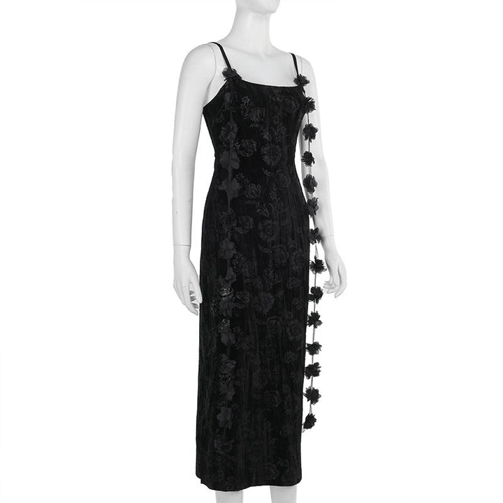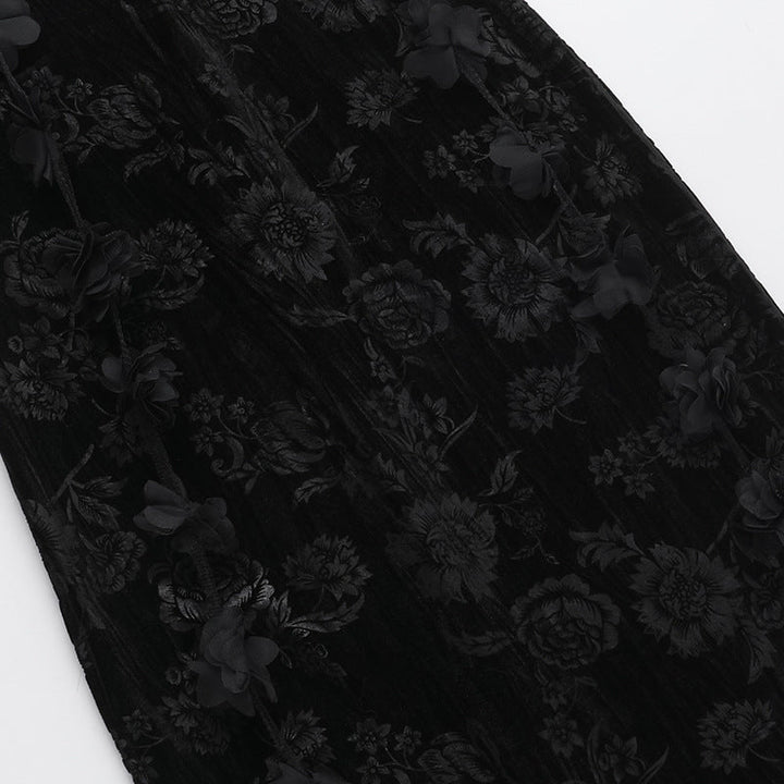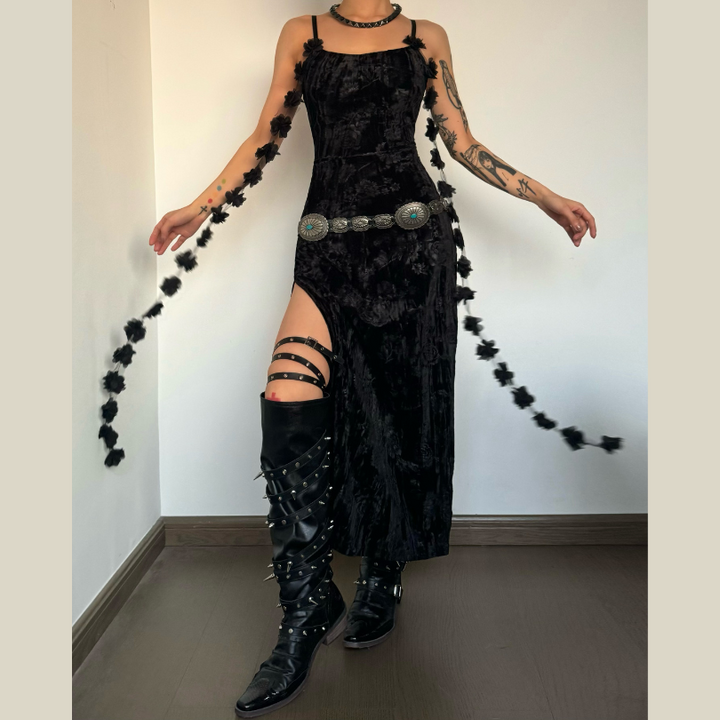 U neck velvet flower pattern slit maxi dress