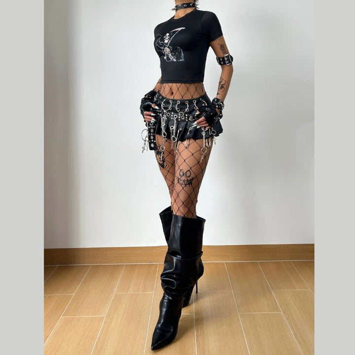 3 piece mini skirt set:Long flared sleeve PU leather rivet metal chain shrug 3 piece mini skirt set