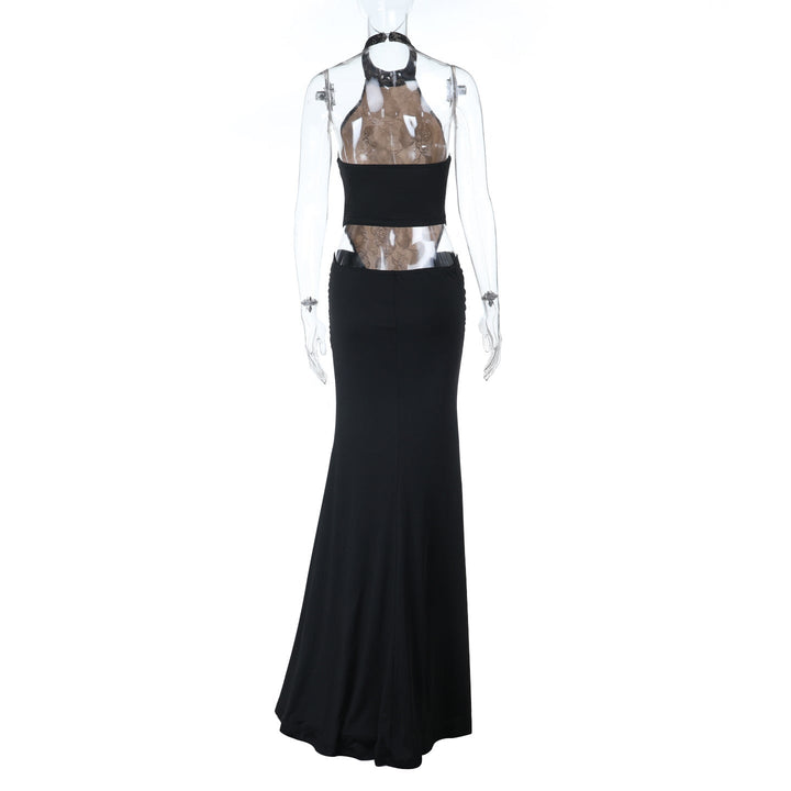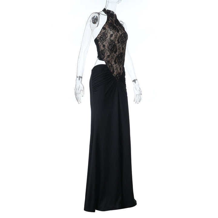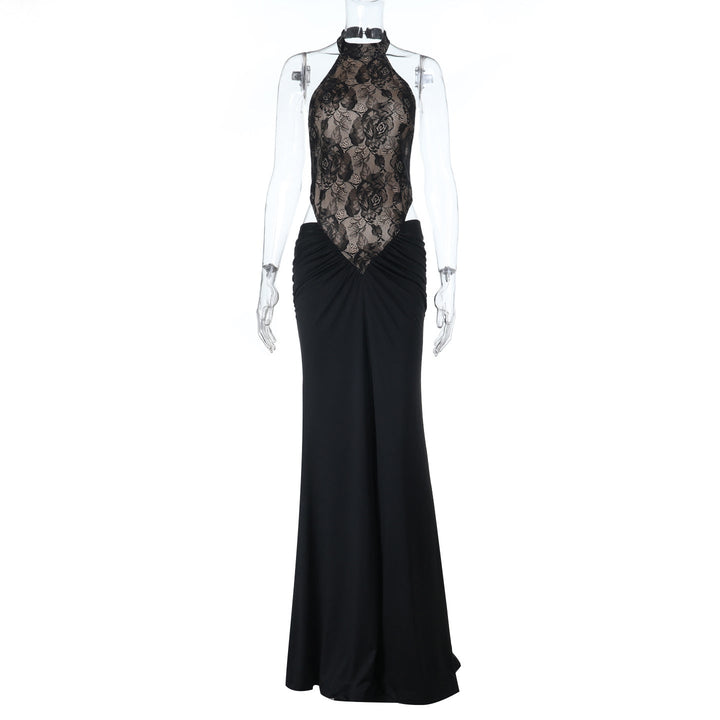 Halter button lace ruched backless maxi dress