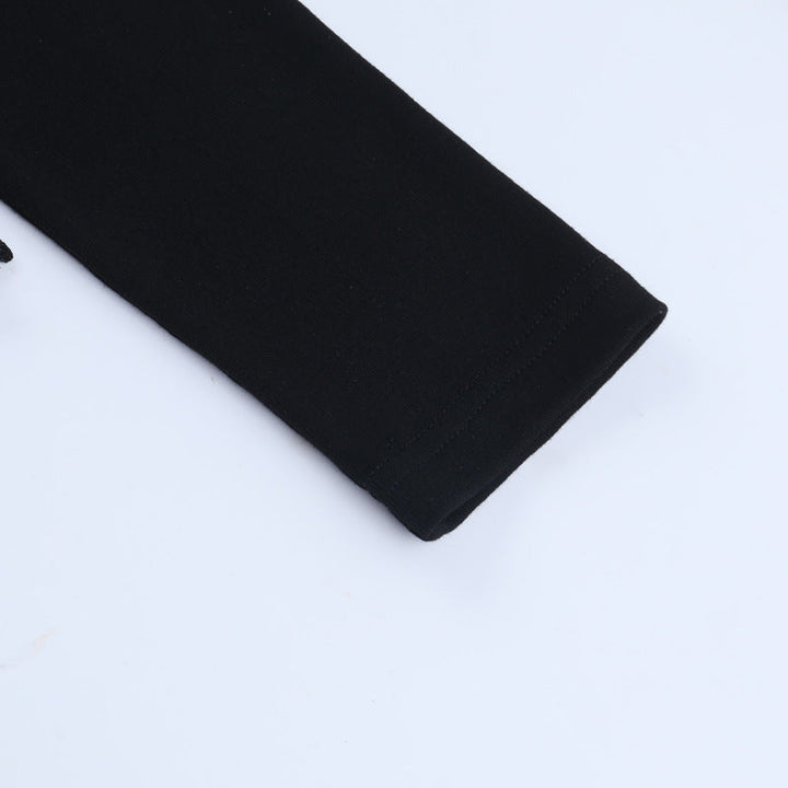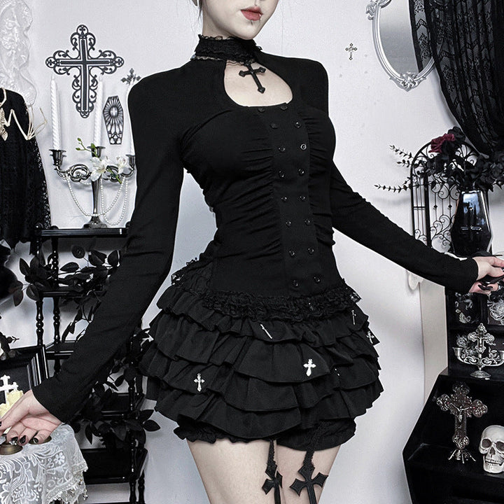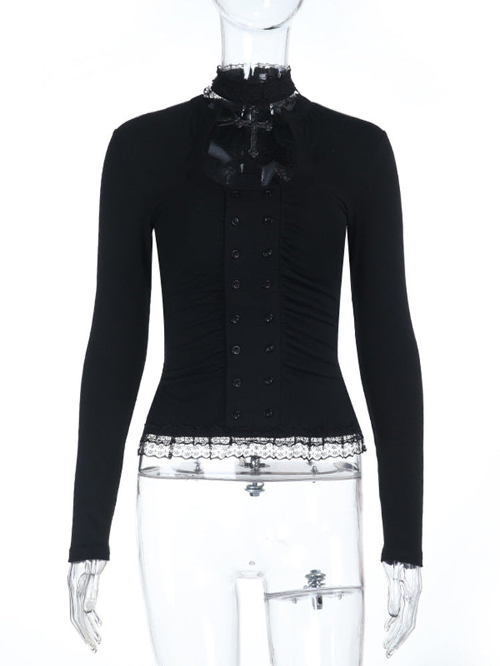 High neck long sleeve hollow out lace hem button top