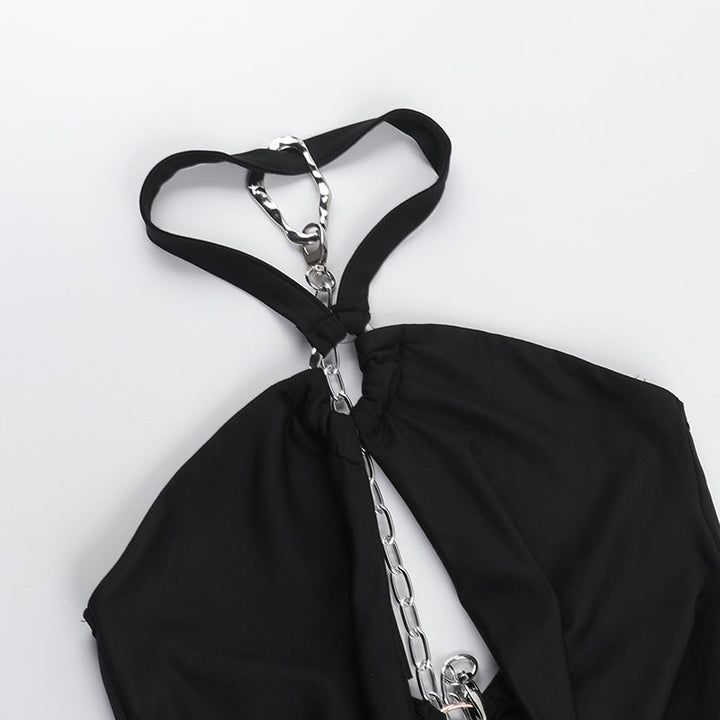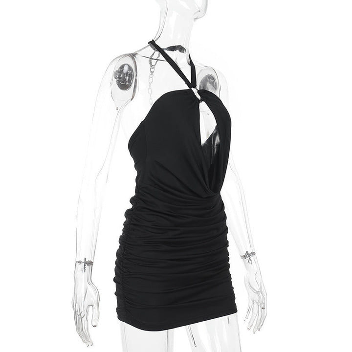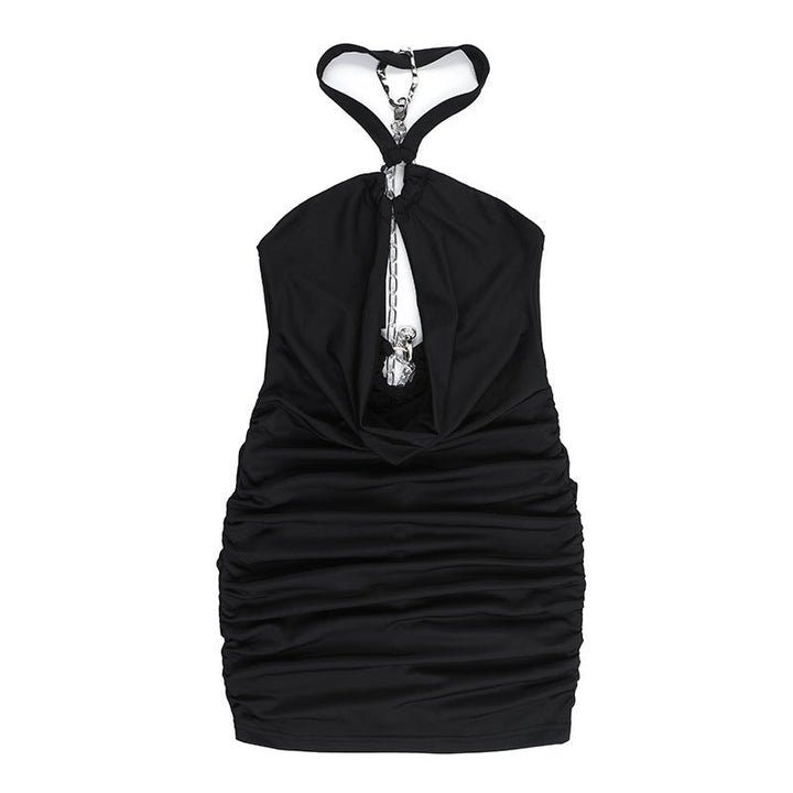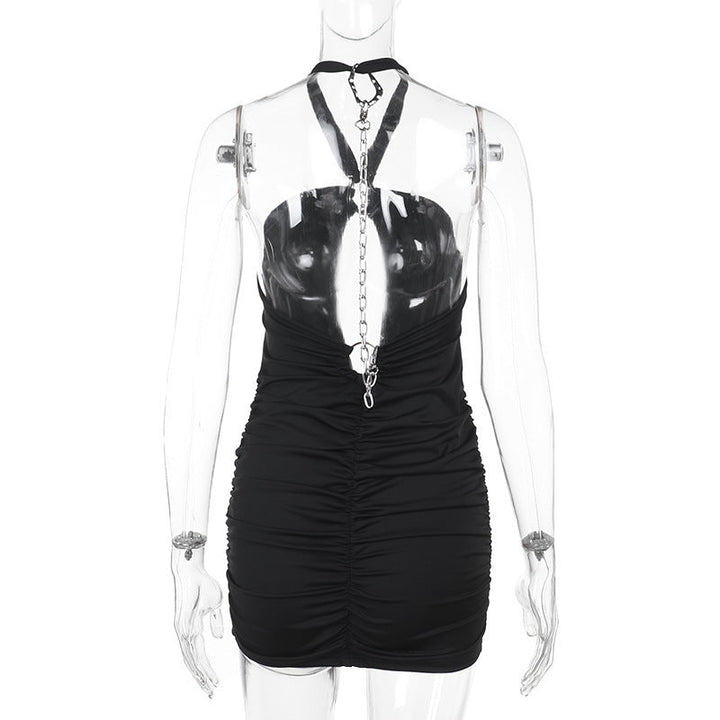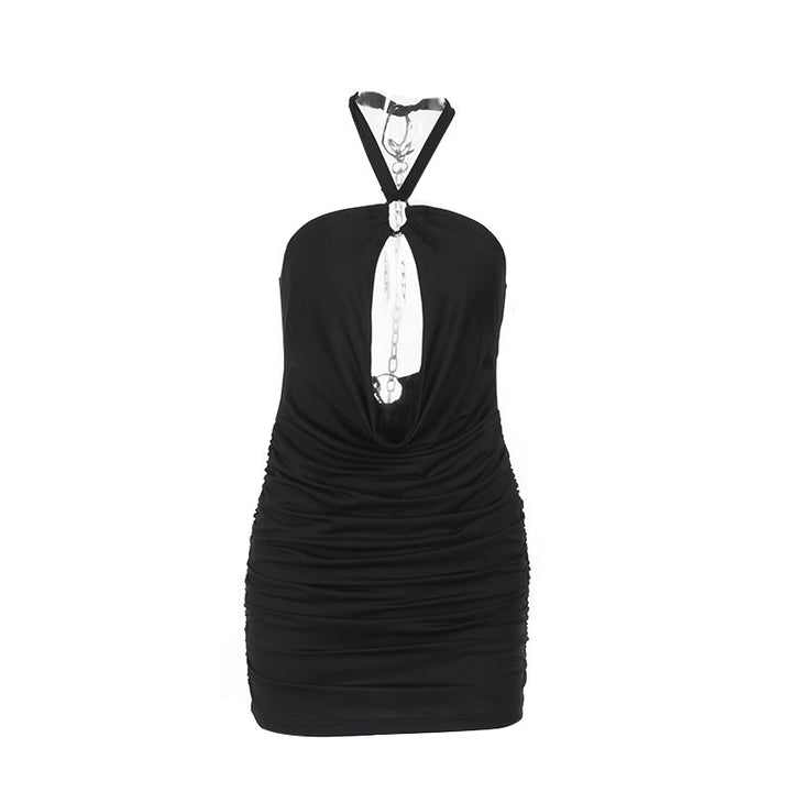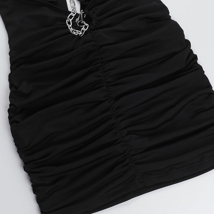 Halter ruched metal chain hollow out mini dress