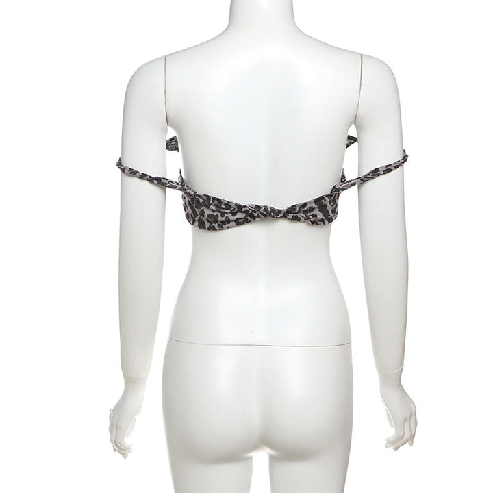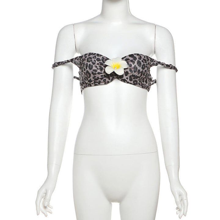 Leopard print flower applique off shoulder tube top