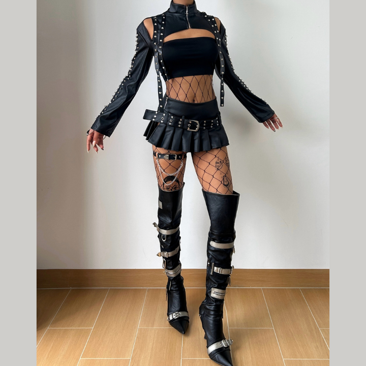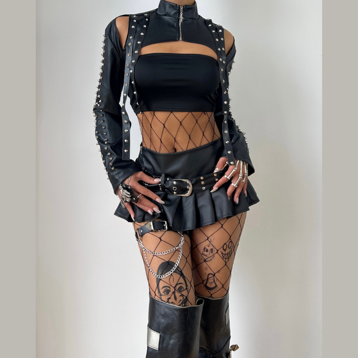 Zip-up long sleeve PU leather rivet applique hollow out top