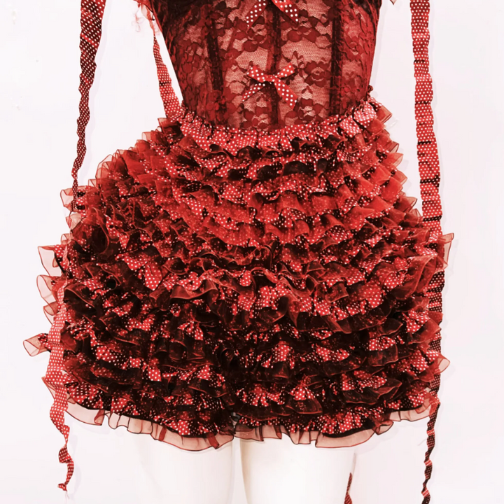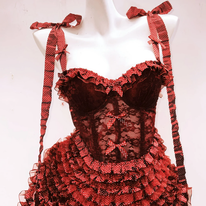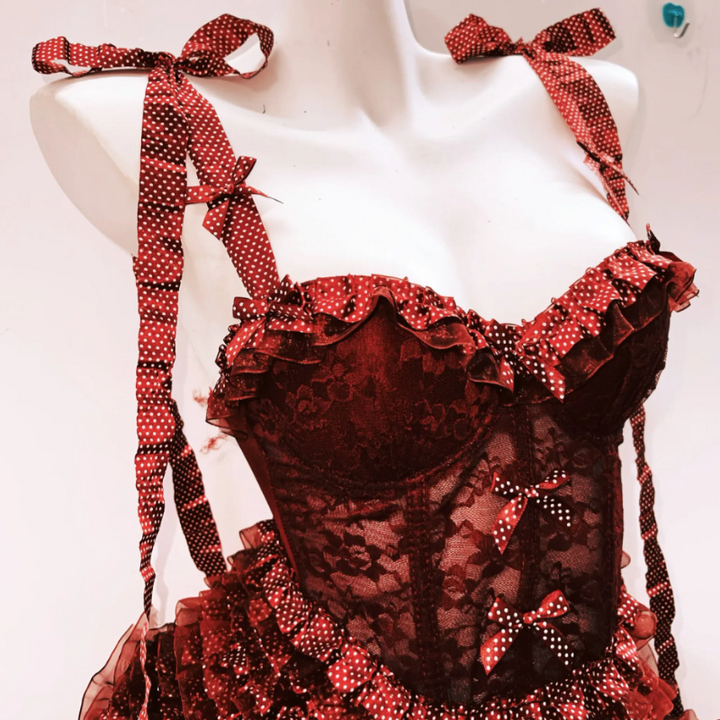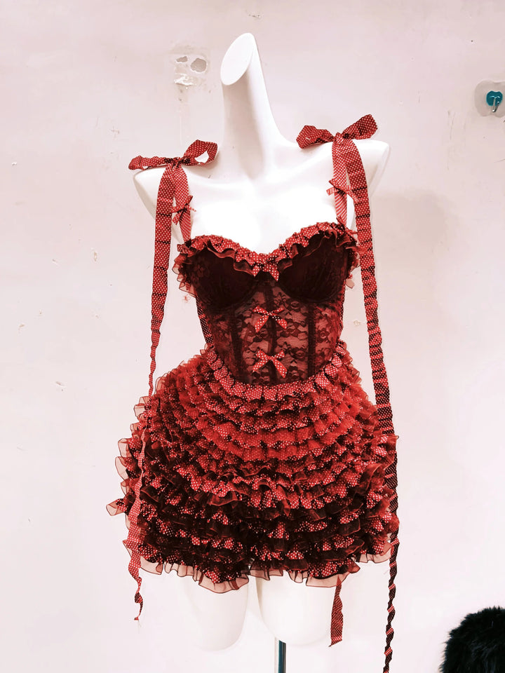 Bowknot ruffle polka dot v neck cami mini skirt set