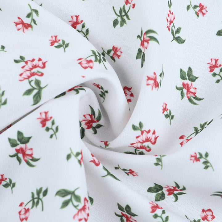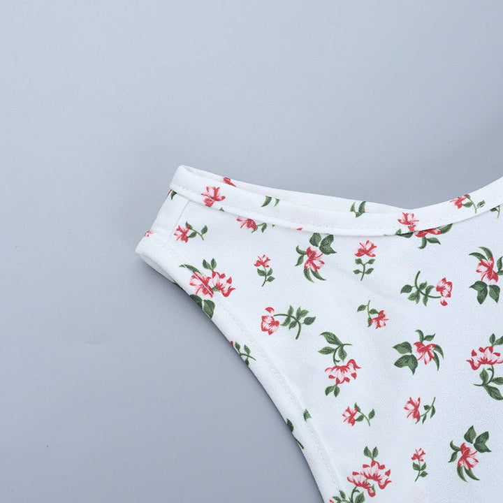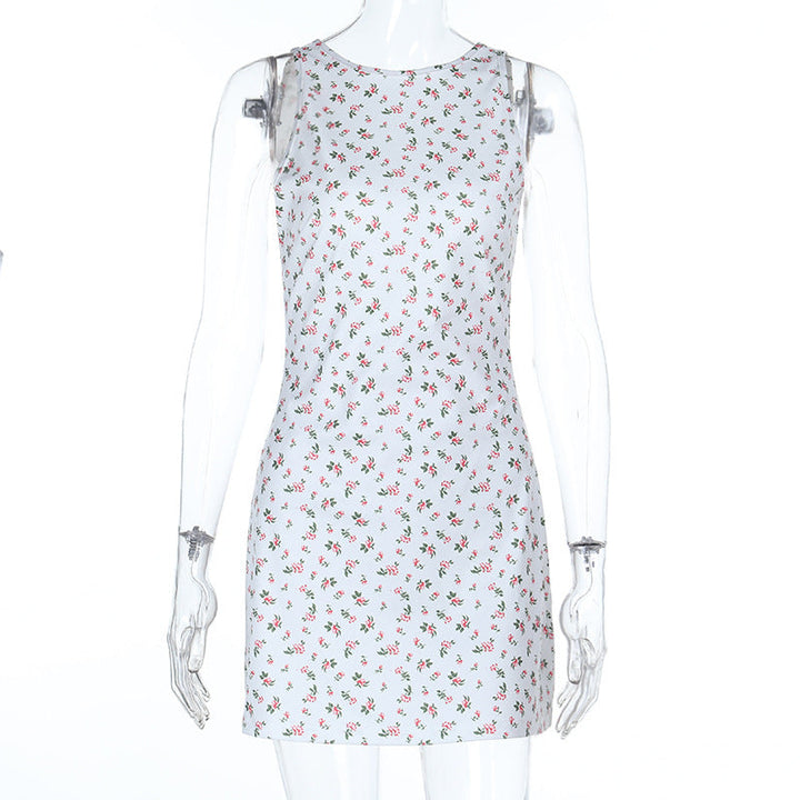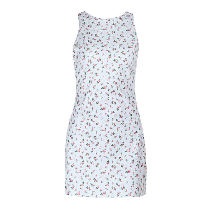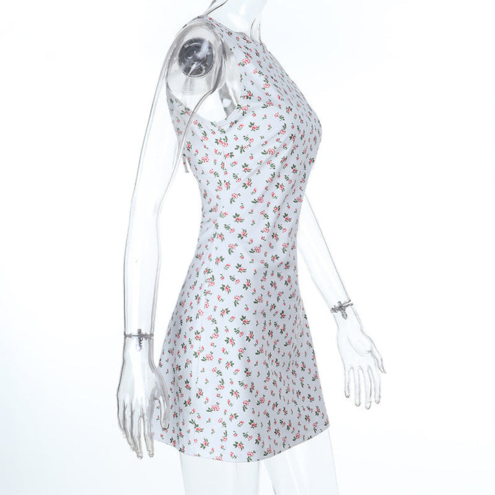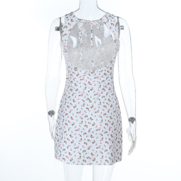 Crewneck flower print backless self tie mini dress
