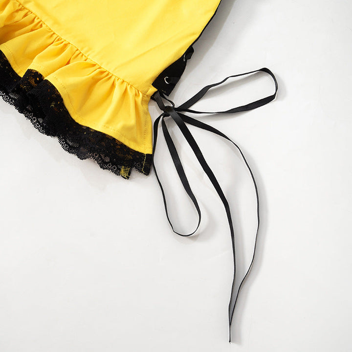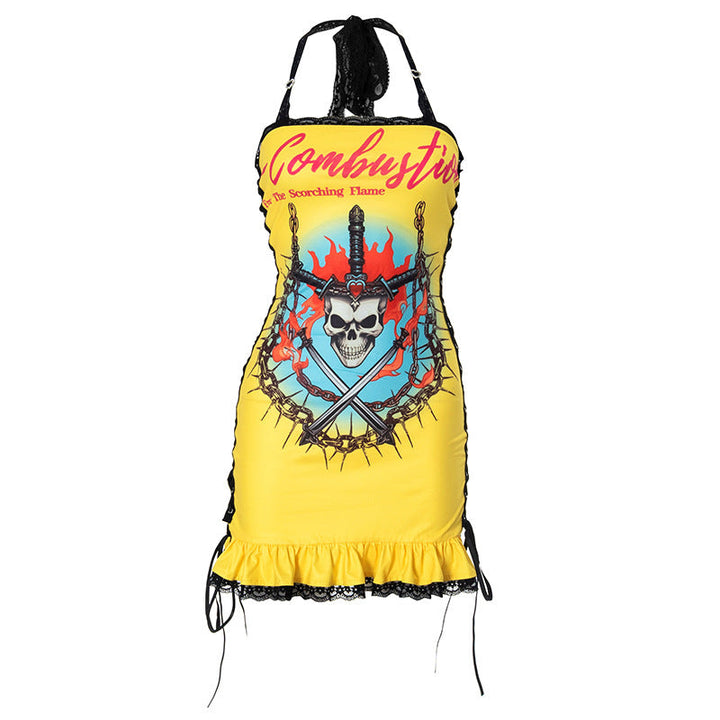 Halter lace hem abstract print lace up mini dress