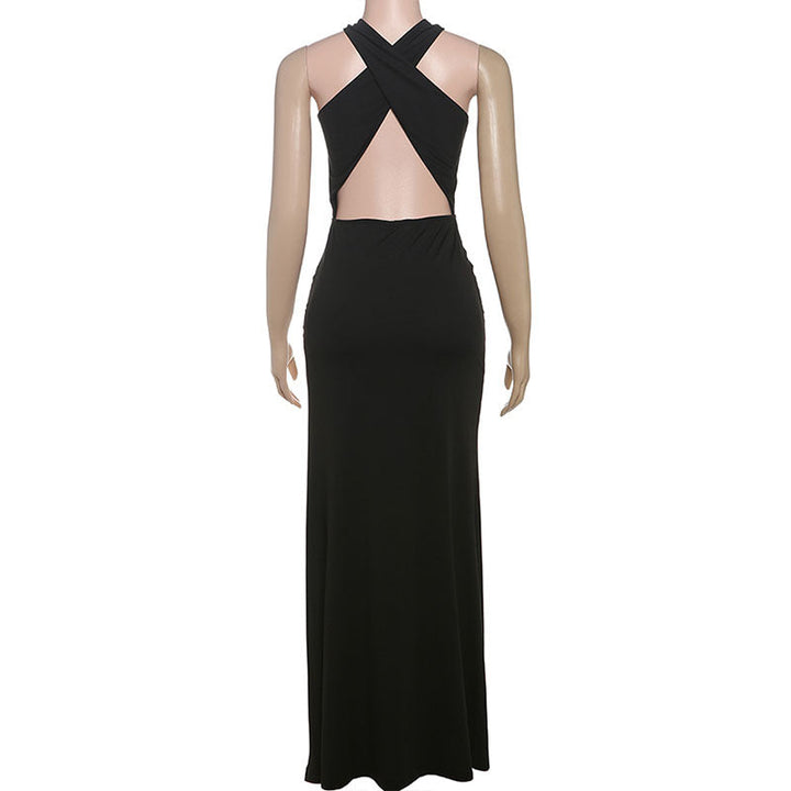 Hollow out cross front slit solid maxi dress