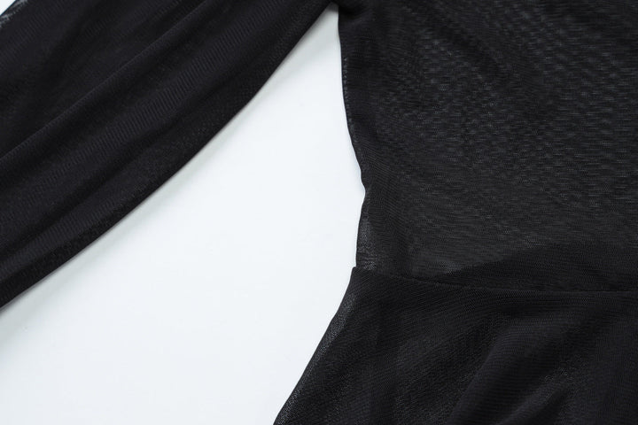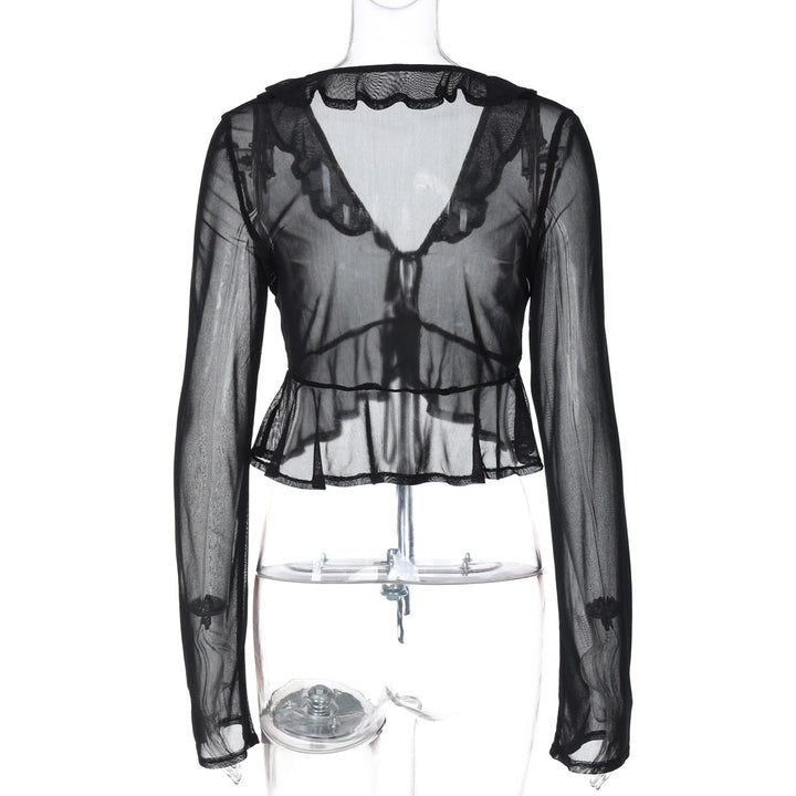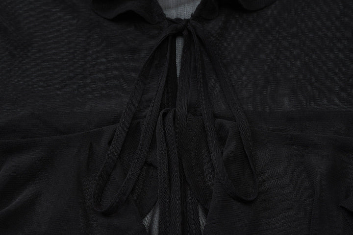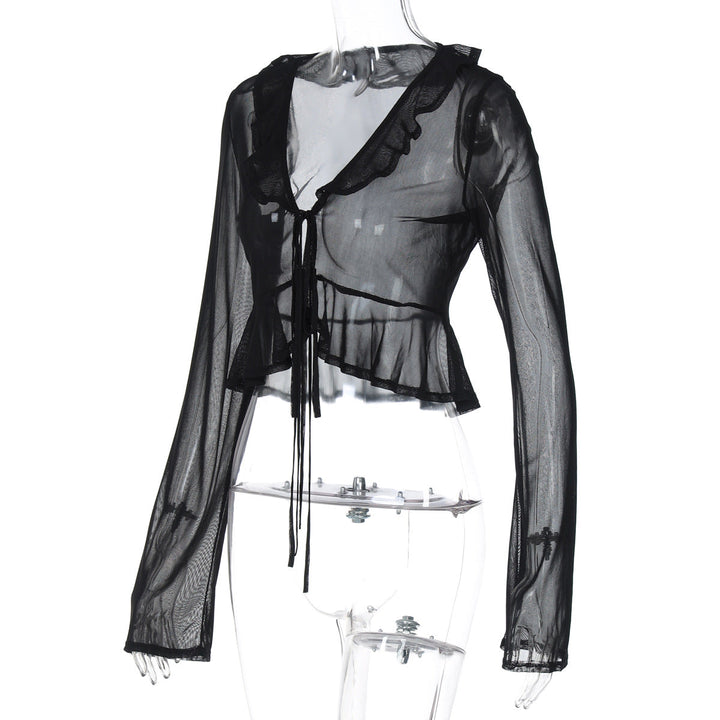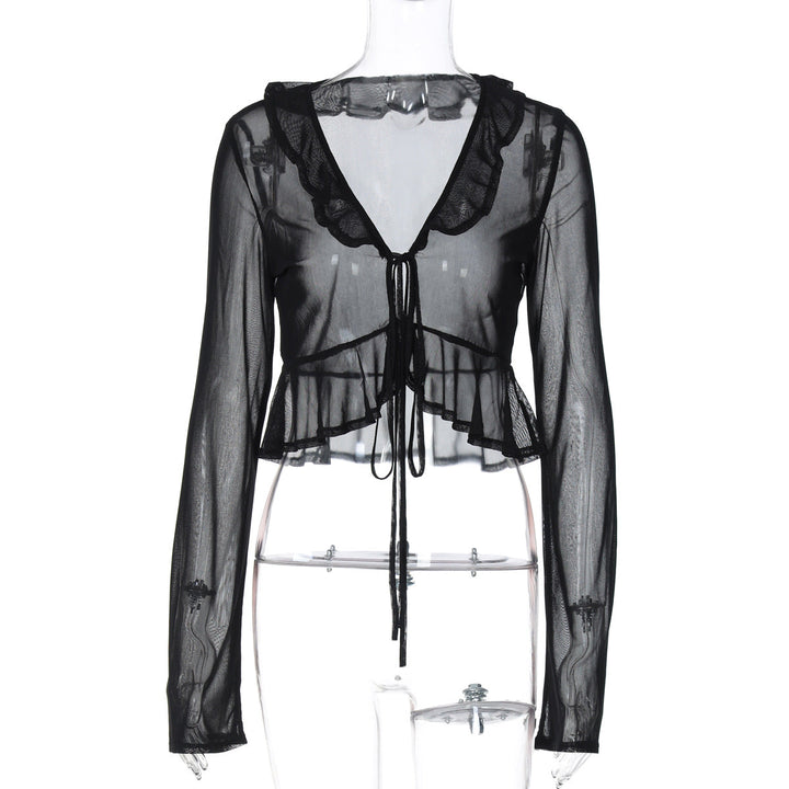 Long sleeve sheer mesh ruffle self tie top