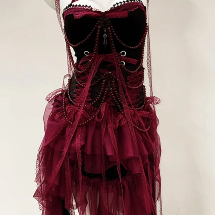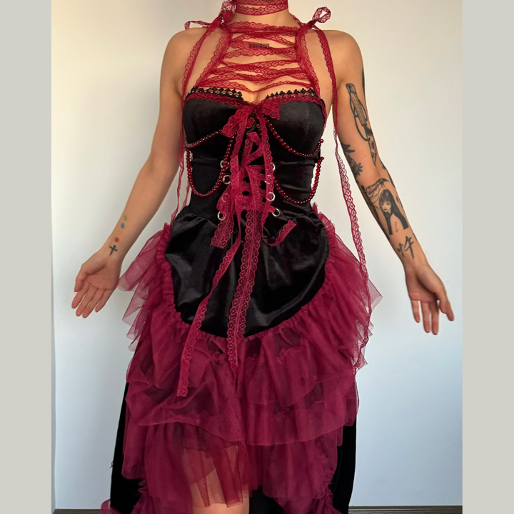 Mesh velvet patchwork lace hem beaded midi dress