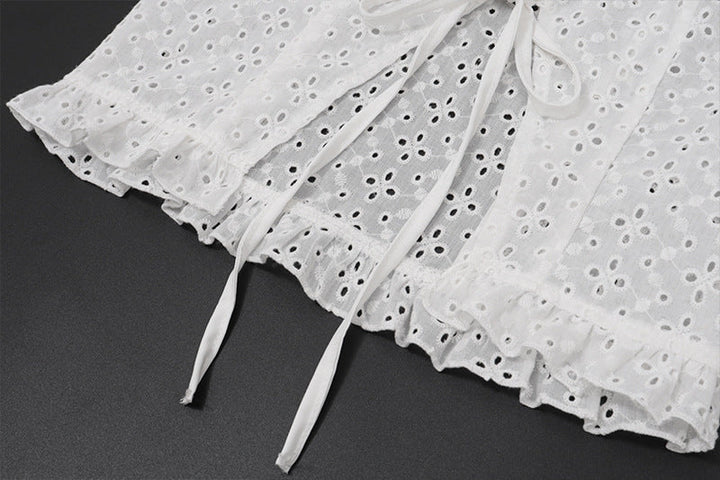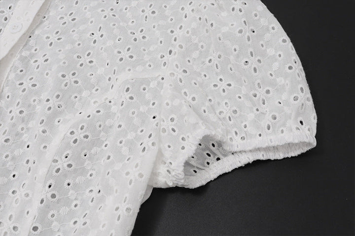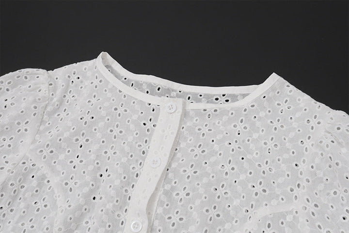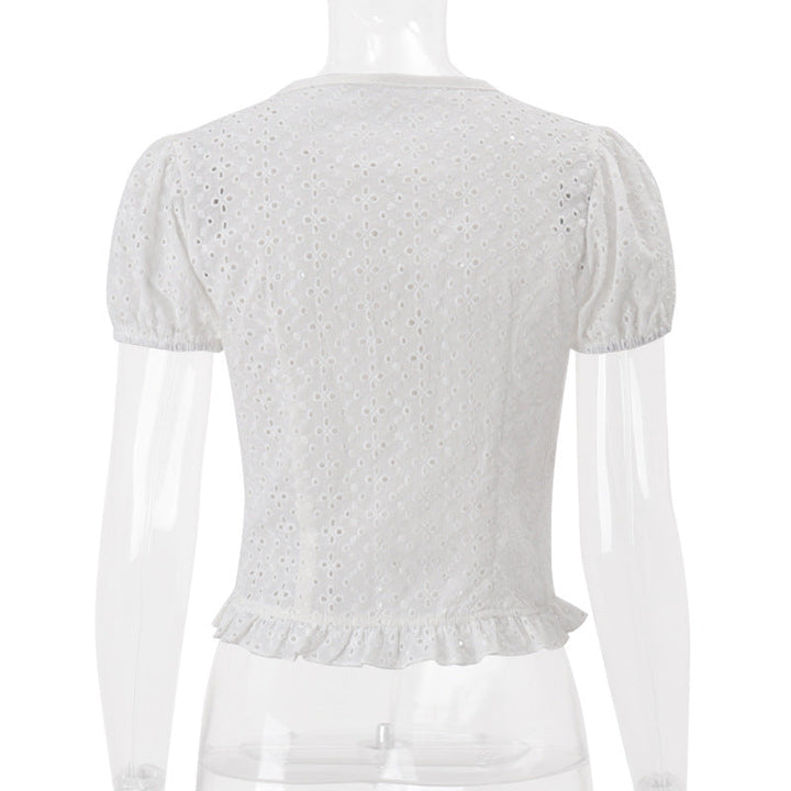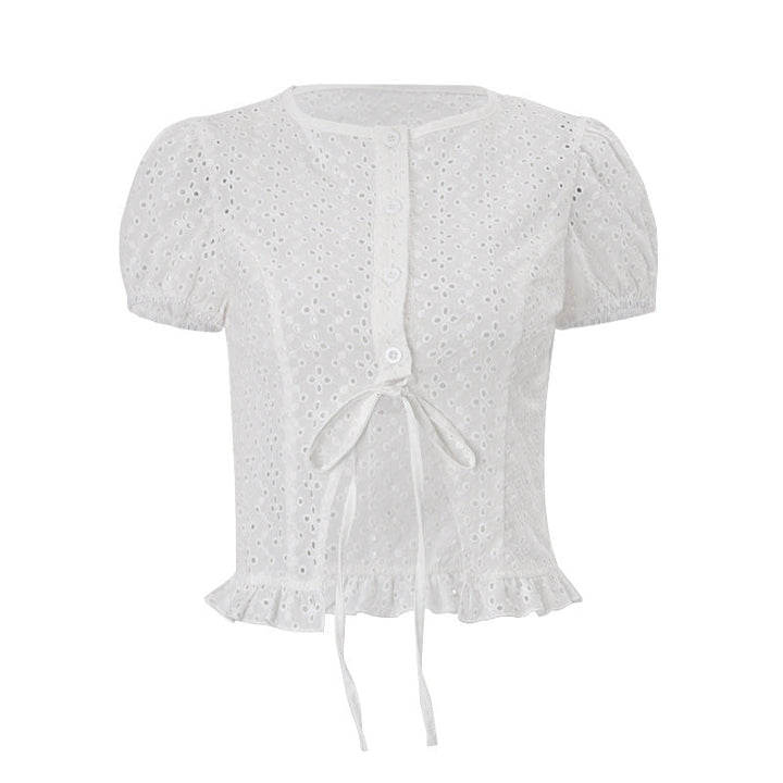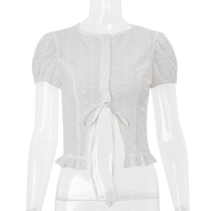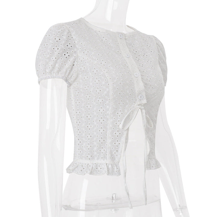Short sleeve crewneck button hollow out crop top
