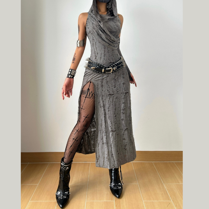 Sleeveless gloves hoodie textured high slit ruched midi dress