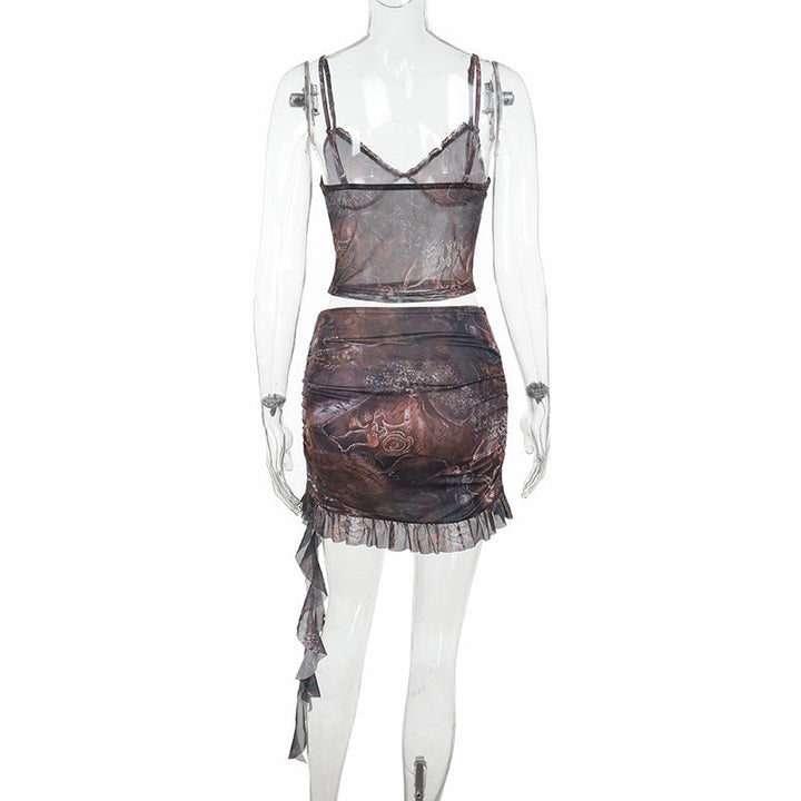 V neck mesh ruffle contrast cami mini skirt set